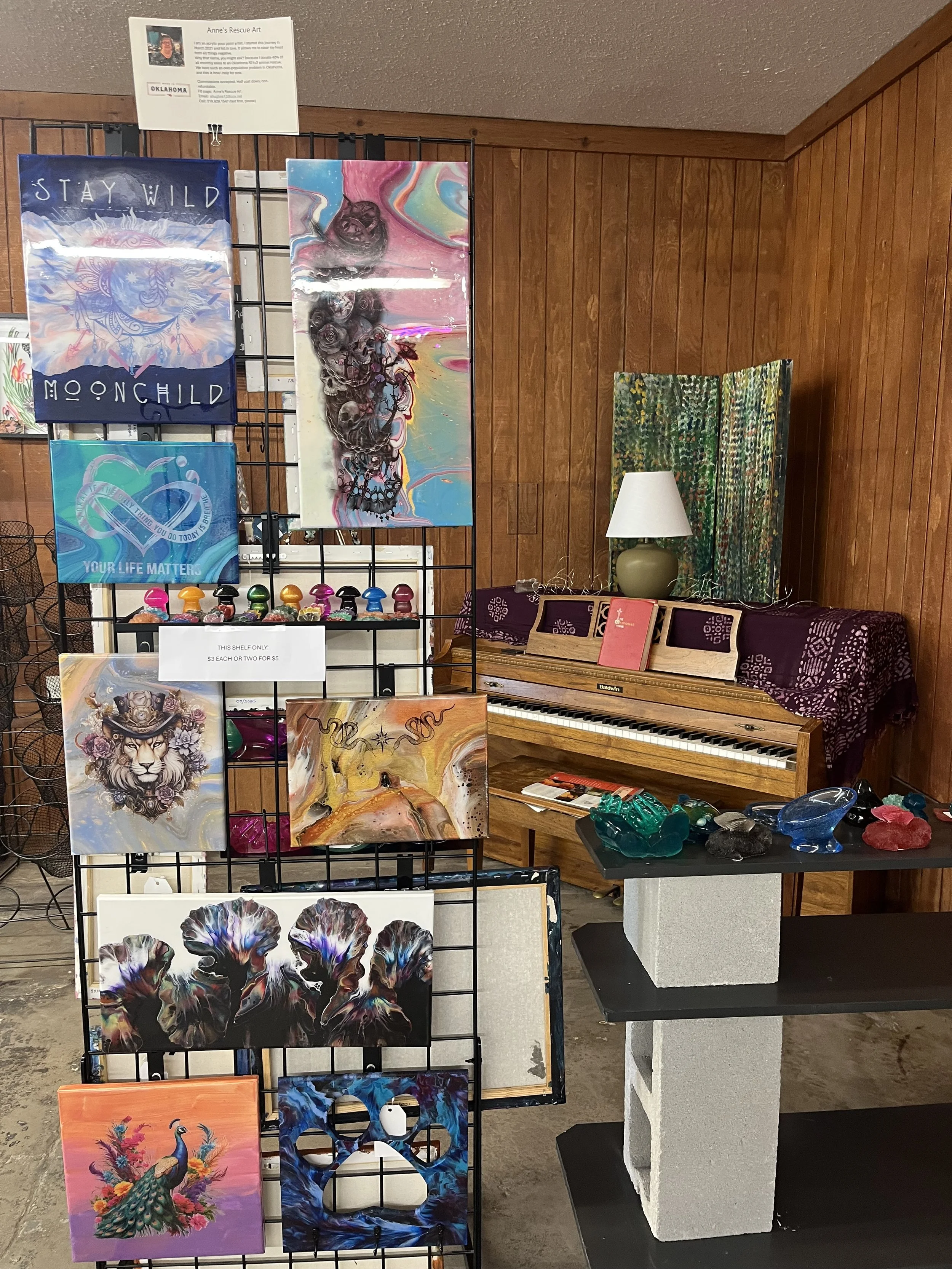 Anne is a acrylic pour paint artist. She has been creating unique designs since 2021. She is a recognized MADE IN OKLAHOMA vendor. She donates 40% of her monthly sales to an Okla 501c3 animal rescue each month.